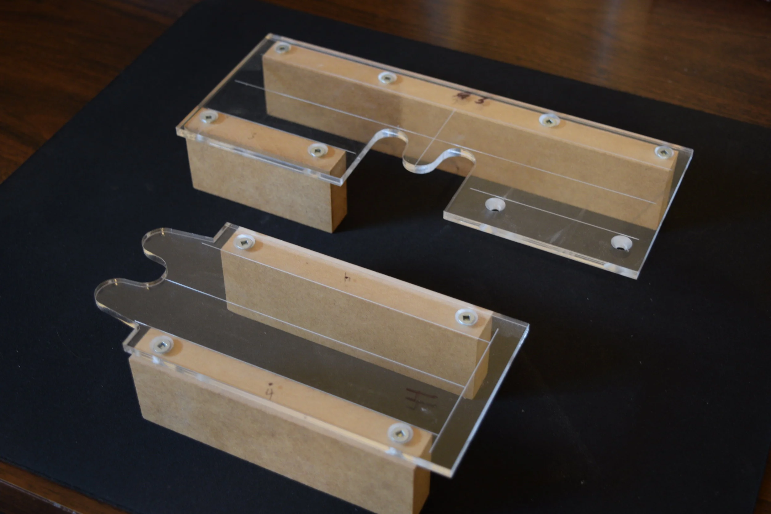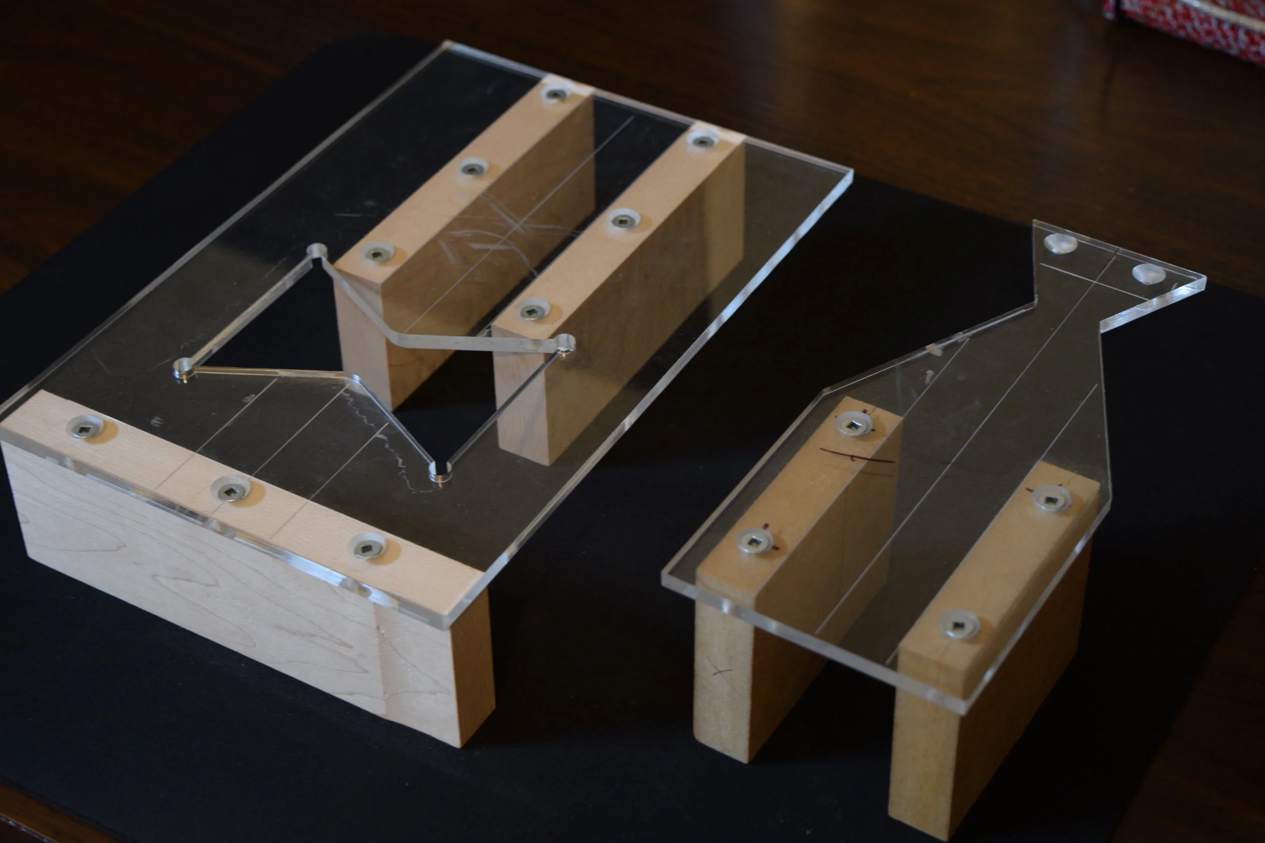 Using SketchUp I modeled the components and drafted some basic plans for myself to use. I also designed plexiglass router guides to use to make all of the joinery. I drafted them in Illustrator, laser cut the plexiglass, and assembled them with countersunk flatheads into MDF. The bed frame is made from Red Oak for its strength and the slats are Hickory for its flexibility.